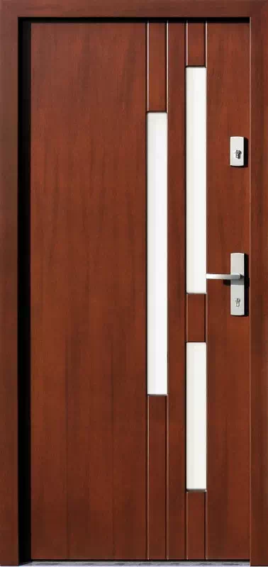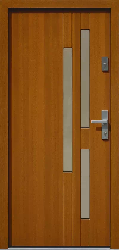 Niniejszy wzór drzwi wejściowych został zaprojektowany do nowoczesnych domach jednorodzinnych. Powyższy, przykładowy egzemplarz drzwi zewnętrznych został wymalowany na kolor: ciemny dąb.