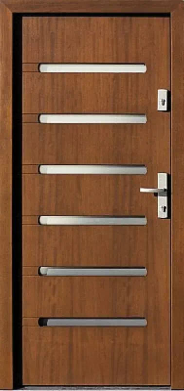 Wzór tych drzwi był odpowiedzią na trendy wzornicze pierwszej dekady XXI wieku. Powyższy, przykładowy egzemplarz drzwi zewnętrznych został wymalowany na kolor: ciemny dąb.