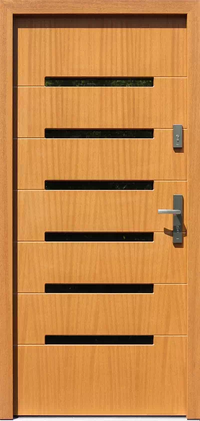 Ten wzór drzwi zewnętrznych najczęściej jest montowany w nowoczesnych jednorodzinnych domach. Powyższy, przykładowy egzemplarz drzwi zewnętrznych został wymalowany na kolor: jasny dąb.