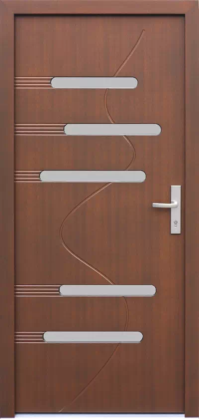 Całość dopełniają po 4 rowki wyfrezowane przy każdej szybie od strony zawiasów. Powyższy, przykładowy egzemplarz drzwi zewnętrznych został wymalowany na kolor: orzech.