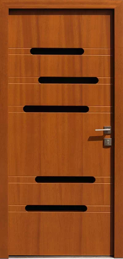 Całość dopełniają po 2 rowki wyfrezowane przy każdej szybie na przedłużeniu ich górnych krawędzi. Powyższy, przykładowy egzemplarz drzwi zewnętrznych został wymalowany na kolor: ciemny dąb.