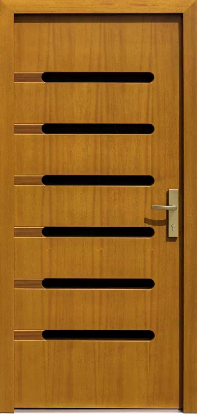 Całość dopełniają po 2 rowki wyfrezowane przy każdej szybie na przedłużeniu ich górnych krawędzi od strony zawiasów oraz wstawki z ciemnego drewna. Powyższy, przykładowy egzemplarz drzwi zewnętrznych został wymalowany na kolor: złoty dąb.