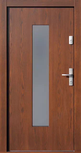 Ekstremalnie proste wzornictwo tego modelu kwalifikuje je do do domów o bardzo nowoczesnej architekturze. Powyższy, przykładowy egzemplarz drzwi zewnętrznych został wymalowany na kolor: orzech.