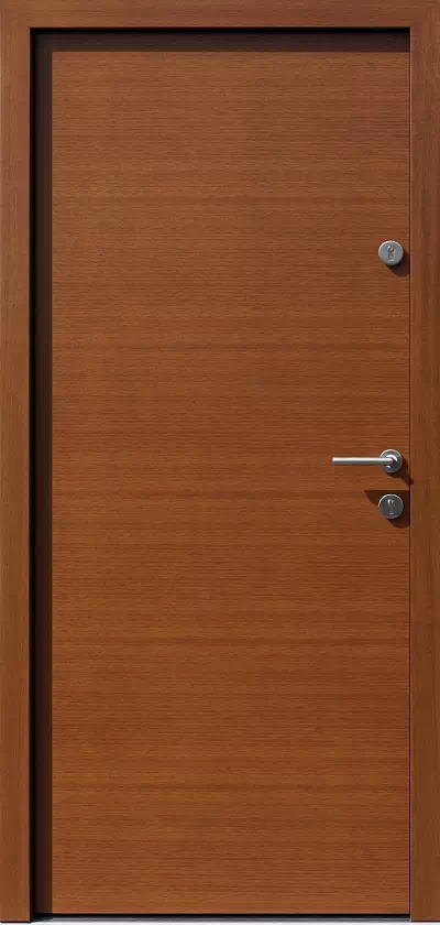 To nietypowe, poziome usłojenie, tych maksymalnie prostych drzwi stanowi ich jedyną ozdobę. Powyższy, przykładowy egzemplarz drzwi zewnętrznych został wymalowany na kolor: złoty dąb.