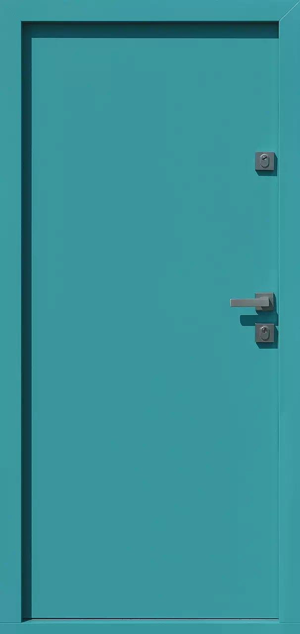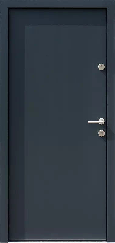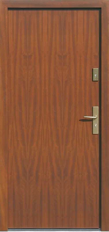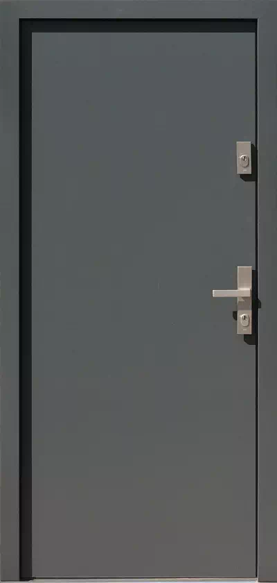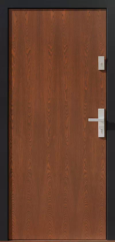 Model ten jest najczęściej wybieranym jako drzwi wejściowe do mieszkań w blokach. Powyższy, przykładowy egzemplarz drzwi zewnętrznych został wymalowany na kolor: jasny dąb + antracyt.