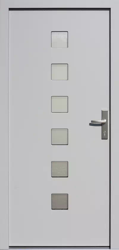 Nowoczesny model tych drzwi może mieć zmienioną ilość szybek i ich wymiary. Powyższy, przykładowy egzemplarz drzwi zewnętrznych został wymalowany na kolor: białe.