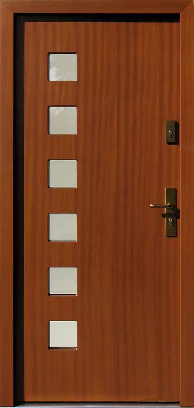 Zapewniają one dosyć dobre doświetlenie wnętrza domu ale mało komfortową obserwację otoczenia przed domem (przed chwyceniem klamki musimy przemieścić się w stronę zawiasów). Powyższy, przykładowy egzemplarz drzwi zewnętrznych został wymalowany na kolor: teak.