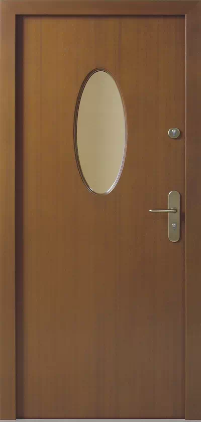 Szyba w tych drzwiach może być ozdobiona piaskowanym wzorem np w formie wąskiej przeziernej obwódki dookoła szyby. Powyższy, przykładowy egzemplarz drzwi zewnętrznych został wymalowany na kolor: złoty dąb.