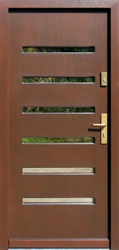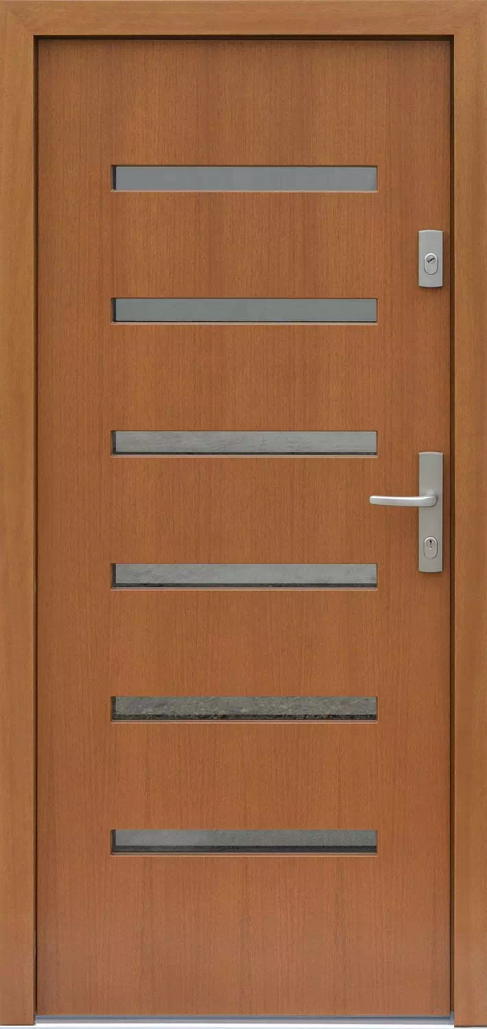 Ten model drzwi do montowania w nowoczesnych domach jednorodzinnych wymagających nie wymagają dużego doświetlenia wnętrz domu za nimi. Powyższy, przykładowy egzemplarz drzwi zewnętrznych został wymalowany na kolor: złoty dąb.