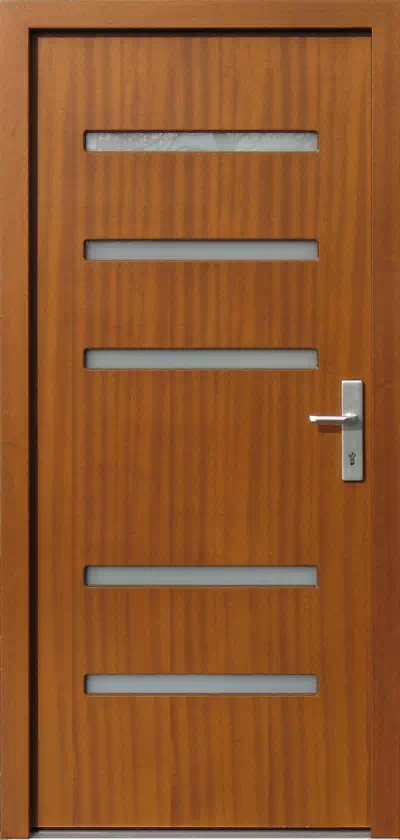 Również ten model drzwi przeznaczony jest do montowania w nowoczesnych domach jednorodzinnych które nie wymagają dużego doświetlenia wnętrz domu za nimi. Powyższy, przykładowy egzemplarz drzwi zewnętrznych został wymalowany na kolor: ciemny dąb.