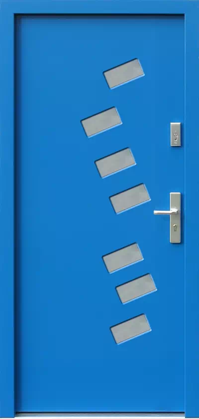 Kąt pochylenia prostokątów do poziomu, oraz ich rozmiar i usytuowanie na skrzydle drzwiowym mogą być dowolnie zmodyfikowane na życzenie zamawiającego. Powyższy, przykładowy egzemplarz drzwi zewnętrznych został wymalowany na kolor: niebieskie.