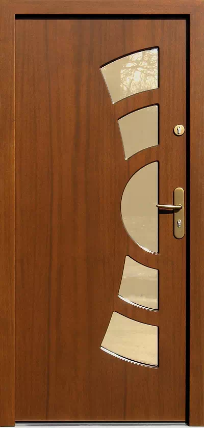 Wzór drzwi wybitnie dedykowany do domów o odważnej współczesnej architekturze stylistycznej. Powyższy, przykładowy egzemplarz drzwi zewnętrznych został wymalowany na kolor: teak.