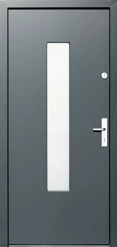 Wymiary i położenie szyby na drzwiach mogą być w szerokim zakresie zmieniane na życzenie klienta. Powyższy, przykładowy egzemplarz drzwi zewnętrznych został wymalowany na kolor: szare.
