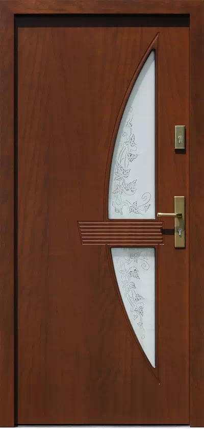 Motywy roslinne (ciemniejsze pola na zdjęciu) są lustrzane i lekko przyciemnione, ale jednocześnie przezierne i umożliwiają dobrą obserwację otoczenia na zewnątrz domu. Powyższy, przykładowy egzemplarz drzwi zewnętrznych został wymalowany na kolor: teakowe.