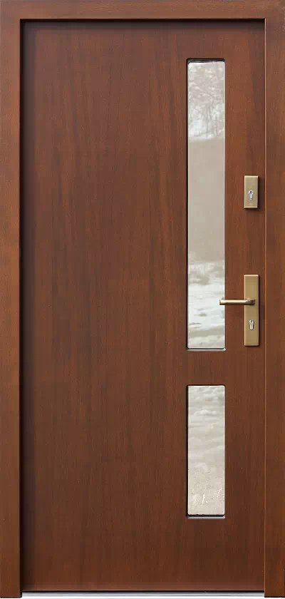Pasuje zarówno do domów wybudowanych w klasyczym jak i nowoczesnym stylu architektonicznym. Powyższy, przykładowy egzemplarz drzwi zewnętrznych został wymalowany na kolor: orzech.