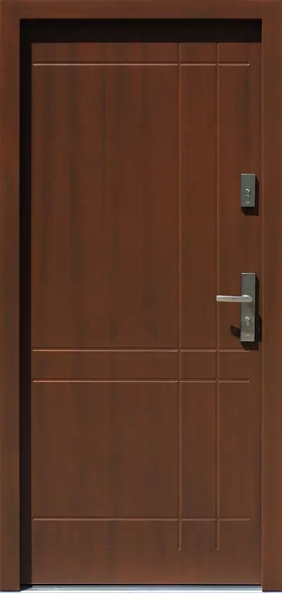 Pasuje zarówno do mieszkań w blokach jak i do domów jednorodzinnych wybudowanych w klasycznym jak i nowoczesnym stylu architektonicznym. Powyższy, przykładowy egzemplarz drzwi zewnętrznych został wymalowany na kolor: orzech.
