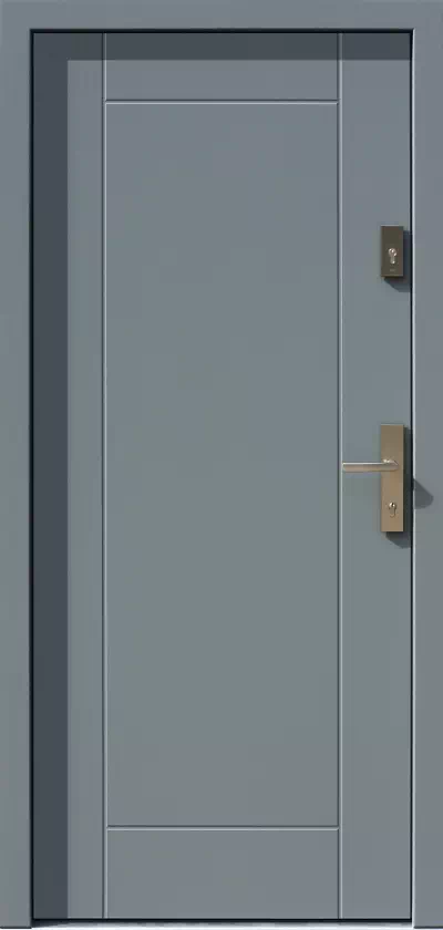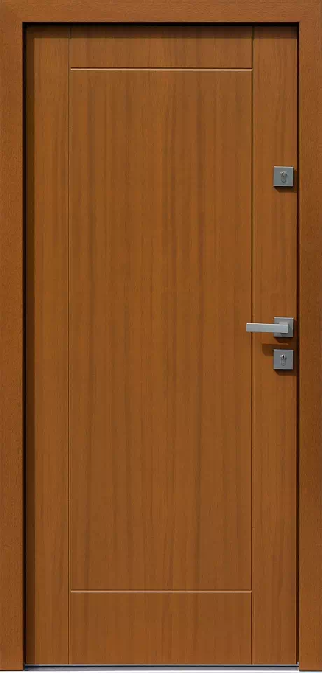 Wzór drzwi zewnętrznych dedykowany do domów jednorodzinnych zarówno o nowoczesnej i klasycznej stylistyce, oraz do mieszkań w budynkach wielorodzinnych. Powyższy, przykładowy egzemplarz drzwi zewnętrznych został wymalowany na kolor: złoty dab.
