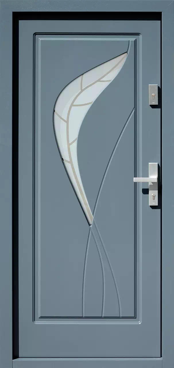 Szyba w tym modelu drzwi zewnętrznych jest zdobiona techniką piaskowania w technologii 2D. Jako baza do piaskowania może być zastosowane szyby: bezbarwne, grafitowe i brązowe z powłoką refleksyjną i bez powłoki refleksyjnej. Powyższy, przykładowy egzemplarz drzwi zewnętrznych został wymalowany na kolor: antracyt.
