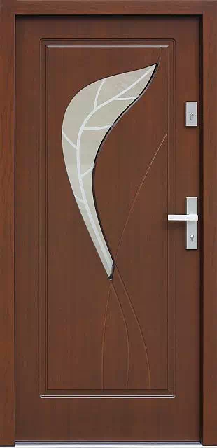 Szyba w tym wzorze jest zdobiona techniką piaskowania w technologii 2D. Jako baza mogą być zastosowane szyby bezbarwne, grafitowe i brązowe z refleksem i bez. Powyższy, przykładowy egzemplarz drzwi zewnętrznych został wymalowany na kolor: orzech.