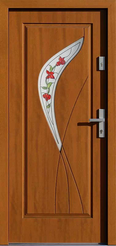 Wersja modelu drzwi zewnętrznych 458,1 w którym zastosowaliśmy zdobioną techniką witrażową szybę zespoloną. Szyba ta została wykonana w technologii angielskiej. Powyższy, przykładowy egzemplarz drzwi zewnętrznych został wymalowany na kolor: złoty dąb.