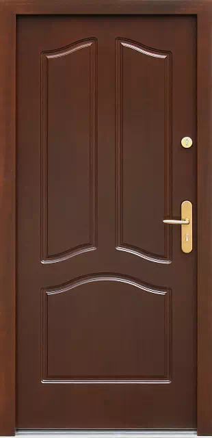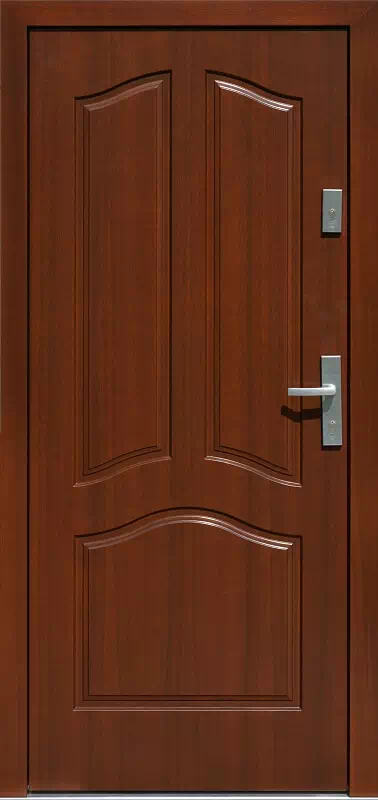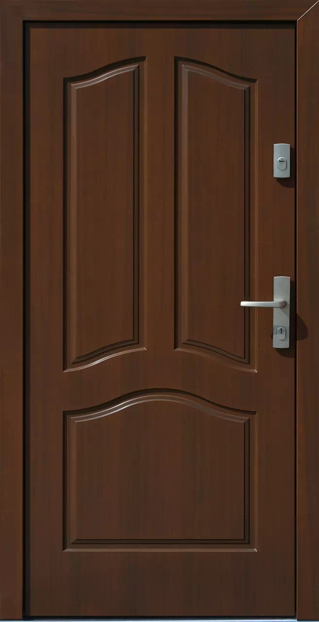 Brak przeszkleń w tym modelu nie doświetli wnętrza za nimi ale przyda domowi klasycznego stylu. Powyższy, przykładowy egzemplarz drzwi zewnętrznych został wymalowany na kolor: orzech.