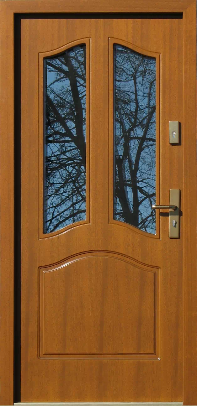 Klasyczne wzornictwo tego modelu dobrze się komponuje z domami urządzonym w tradycyjnym stylu. Jest to jeden z bardziej przeszklonych modeli z naszej oferty produkcyjnej. Powyższy, przykładowy egzemplarz drzwi zewnętrznych został wymalowany na kolor: złoty dąb.