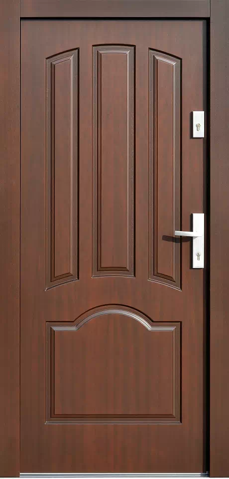 Jego konserwatywna ale bardzo ładnie zharmonizowana forma geometryczna od lat znajduje wielu zwolenników pośród naszych klientów. Powyższy, przykładowy egzemplarz drzwi zewnętrznych został wymalowany na kolor: orzech.