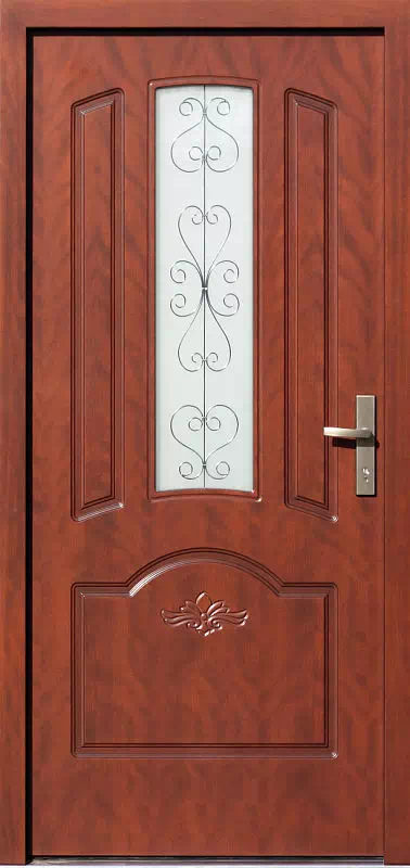 Bardzo (wyżyłowana) duża szerokość szyby zastosowana w tym modelu umożliwia zastosowanie ozdobnych piaskowanych szyb lub witraży. Powyższy, przykładowy egzemplarz drzwi zewnętrznych został wymalowany na kolor: teak.