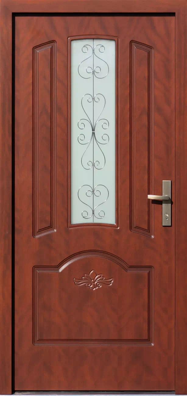 Zwykle w tym modelu drzwi jest montowana szyba zdobiona techniką piaskowania lub witraż angielski lub klasyczny. Powyższy, przykładowy egzemplarz drzwi zewnętrznych został wymalowany na kolor: teak.