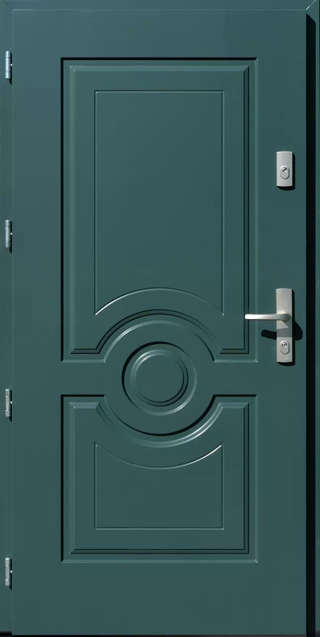 Okrągły kaseton jest dobrym miejscem na zamontowanie kołatki lub okrągłej antaby. Powyższy, przykładowy egzemplarz drzwi zewnętrznych został wymalowany na kolor: zielone.