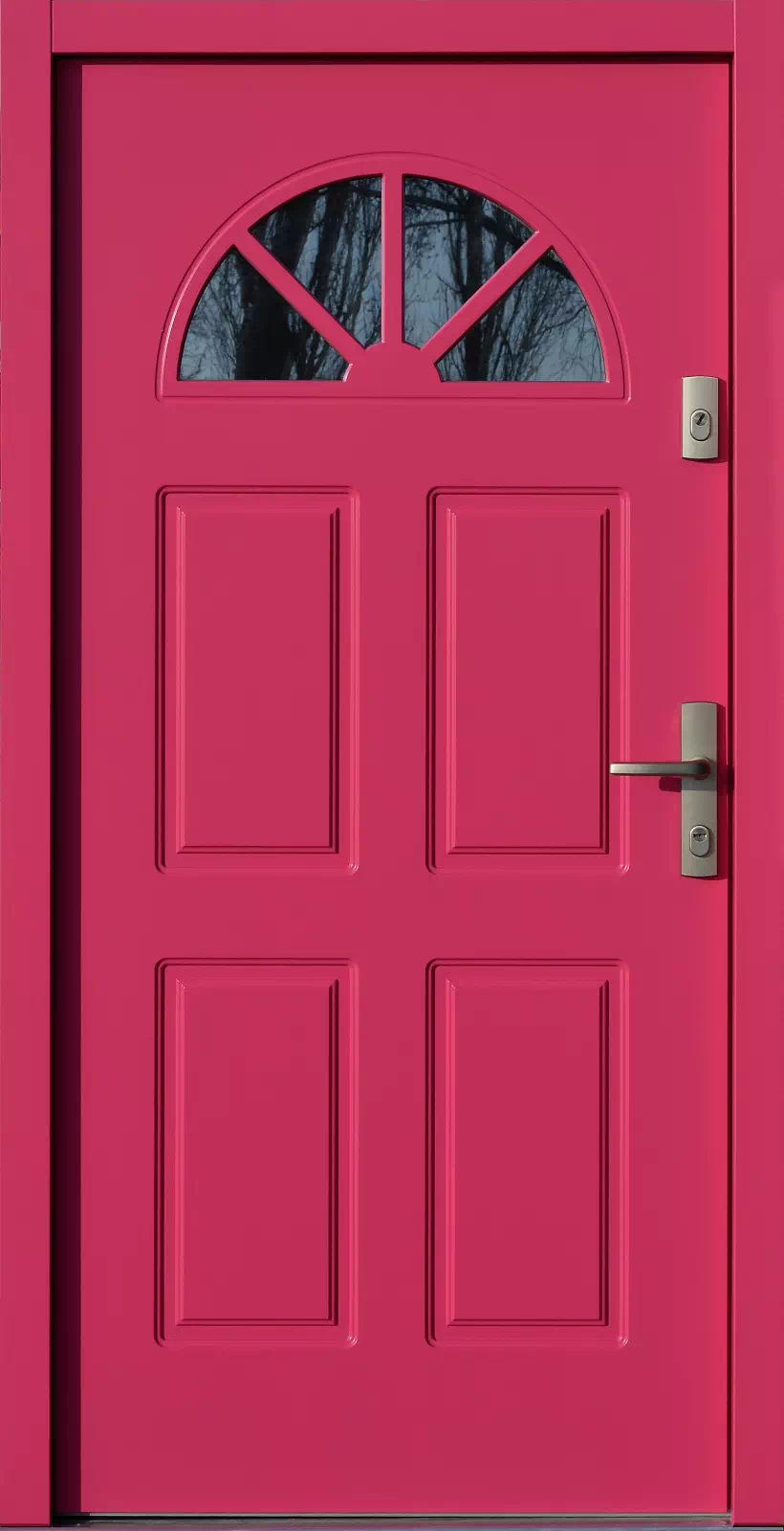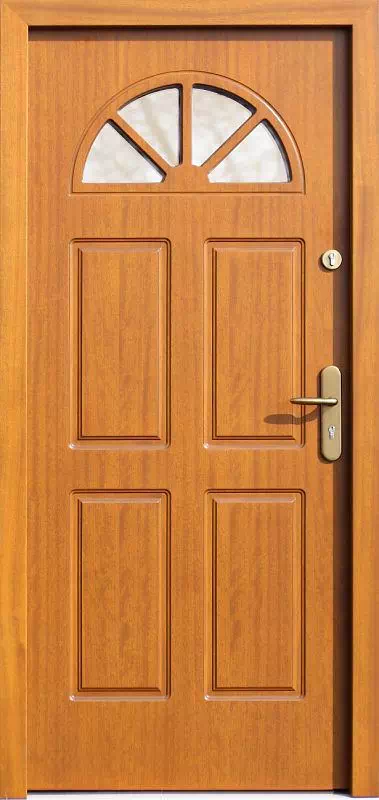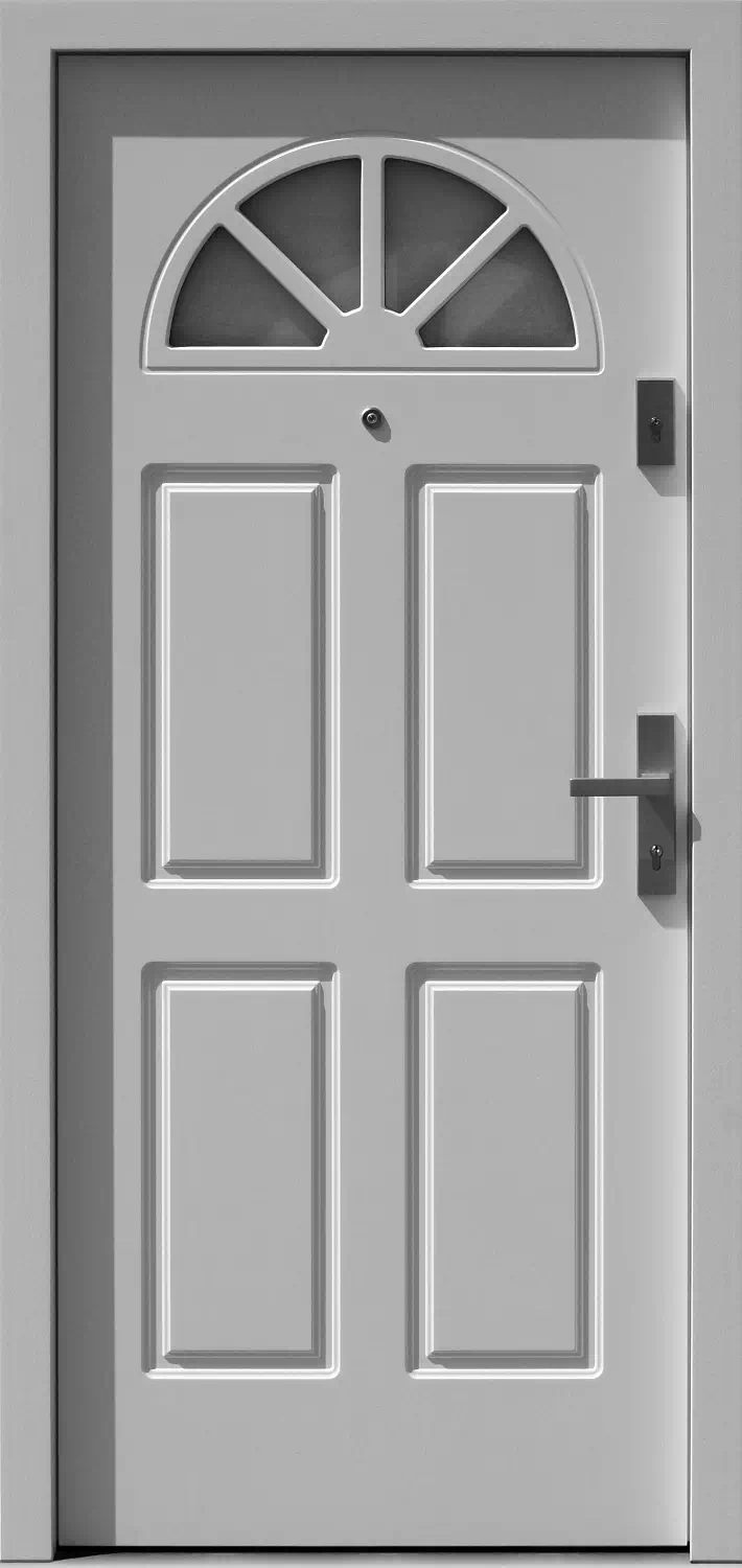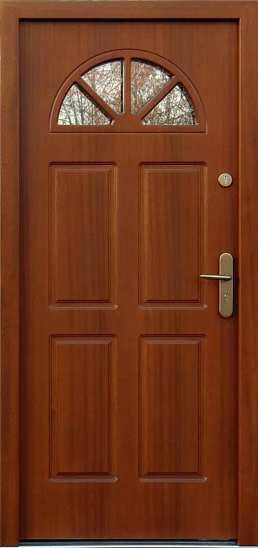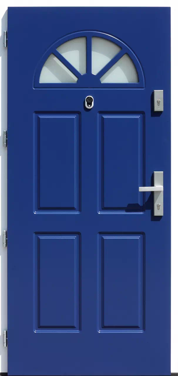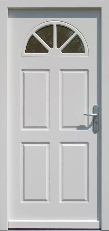 Niewielkie przeszklenia w górnej części skrzydła pełnią rolę bardziej ozdobną niż doświetlającą. Powyższy, przykładowy egzemplarz drzwi zewnętrznych został wymalowany na kolor: biale.