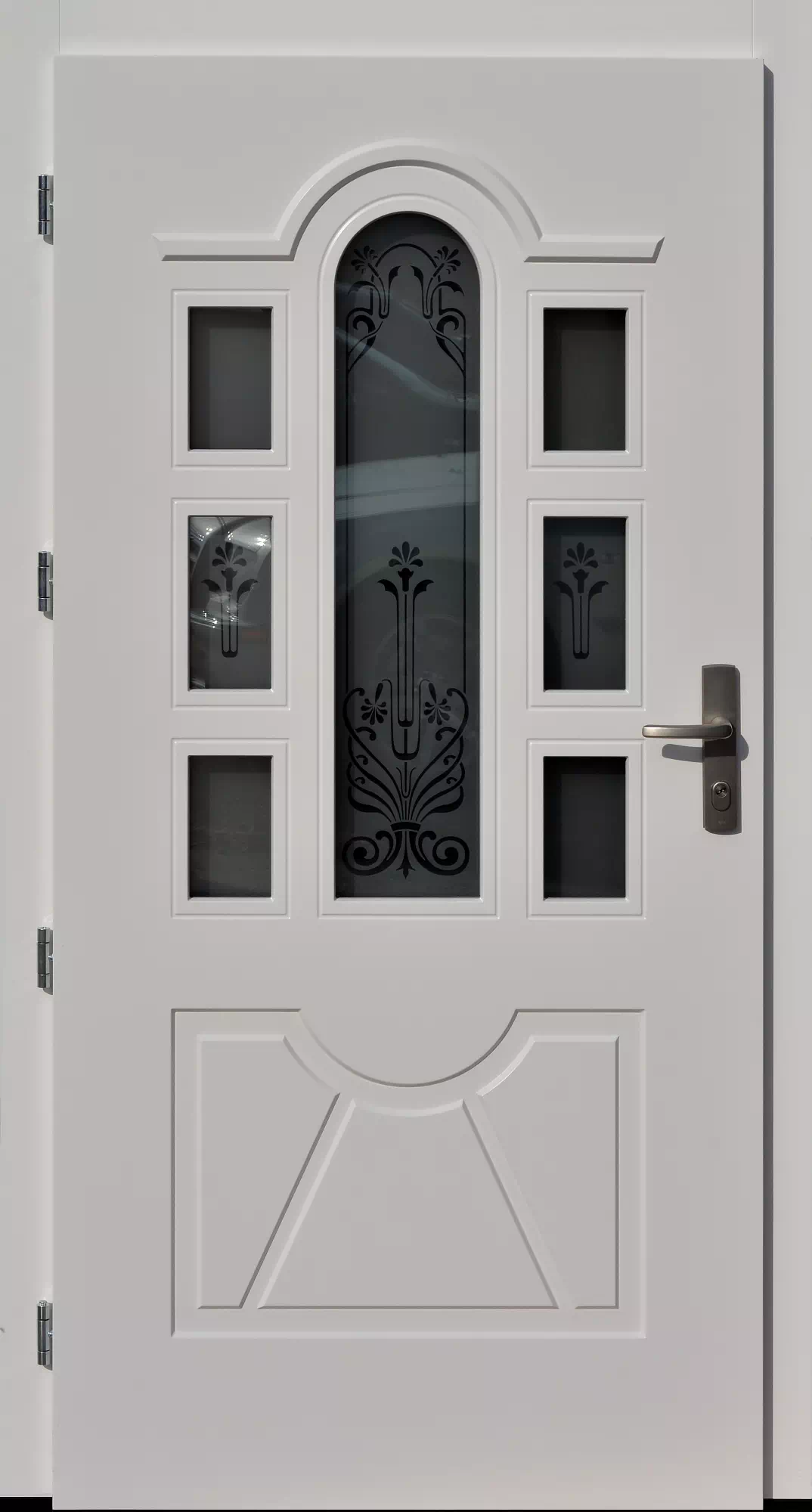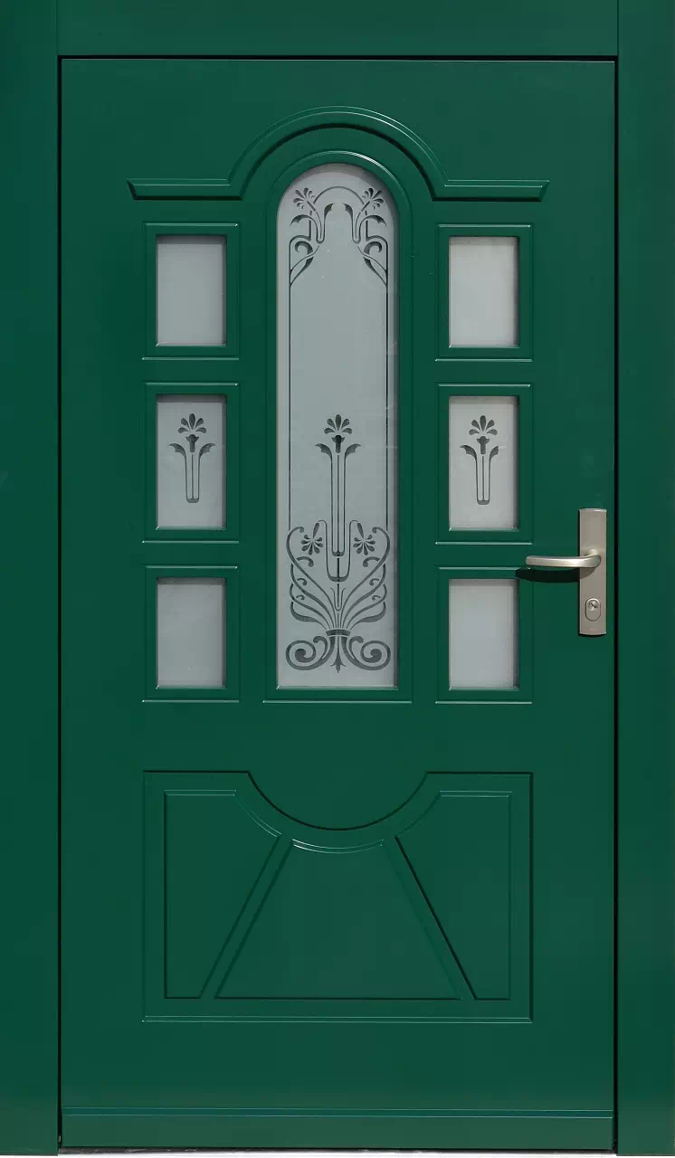 Bogaty wzorniczo model zbudowany z kombinacji małych prostokątnych szybek i jednej większej usytuowanej centralnie. Powyższy, przykładowy egzemplarz drzwi zewnętrznych został wymalowany na kolor: zielone.