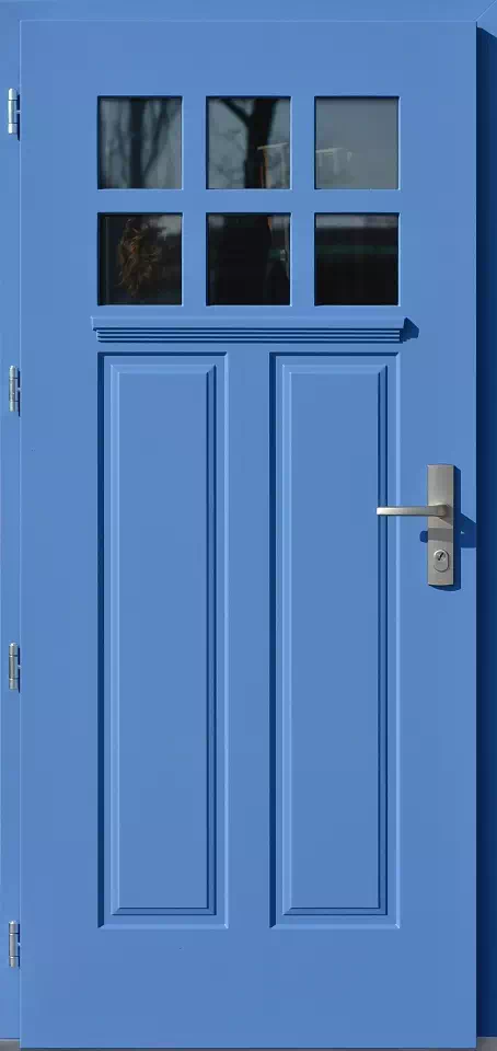 Charakterystycznym dla tego modelu jest zastosowanie ozdobnej listwy ociekaczowej bezpośrednio pod sześcioma małymi przeszkleniami. Powyższy, przykładowy egzemplarz drzwi zewnętrznych został wymalowany na kolor: niebieskie.