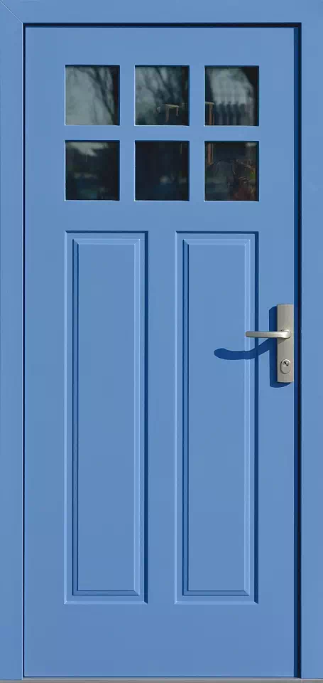 Możliwe jest wyprodukowanie tego wzory drzwi z innym podziałem szyb oraz innymi ich wymiarami. Powyższy, przykładowy egzemplarz drzwi zewnętrznych został wymalowany na kolor: niebieskie.