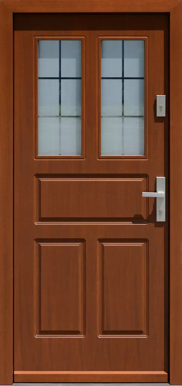 Piaskowany motyw geometryczny wykonanych na szybach tym modelu jest przykładowym, ale jednocześnie też najczęściej zamawianym przez naszych klientów z za Odry. Powyższy, przykładowy egzemplarz drzwi zewnętrznych został wymalowany na kolor: ciemny dąb.