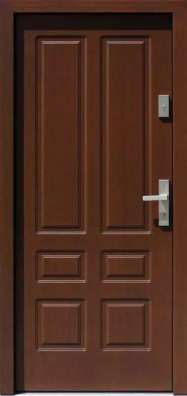 Ten model drewnianych drzwi zewnętrznych jest wybierany wówczas gdy zamówienie obejmuje klasyczne, nieprzeszklone drzwi o wyjątkowo dużym wymiarze. Powyższy, przykładowy egzemplarz drzwi zewnętrznych został wymalowany na kolor: orzech ciemny.