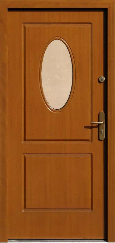 Przeszklenie, mimo że nie zbyt dużych wymiarów, gwarantuje dobrą obserwację otoczenia z wnętrza domu, a także dostatecznie doświetla wiatrołap za drzwiami zewnętrznymi. Powyższy, przykładowy egzemplarz drzwi zewnętrznych został wymalowany na kolor: ciemny dąb.