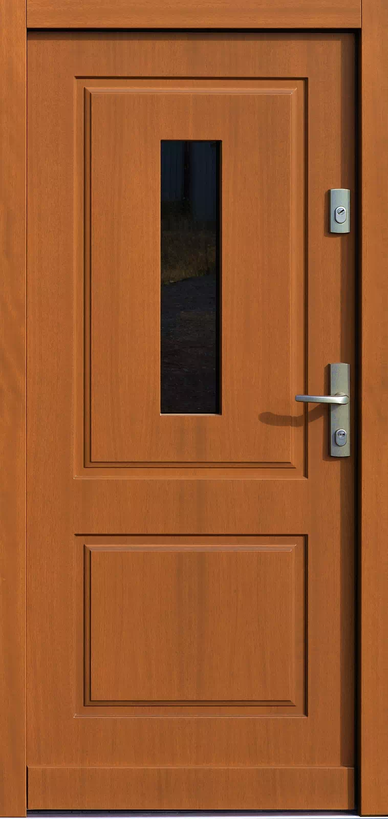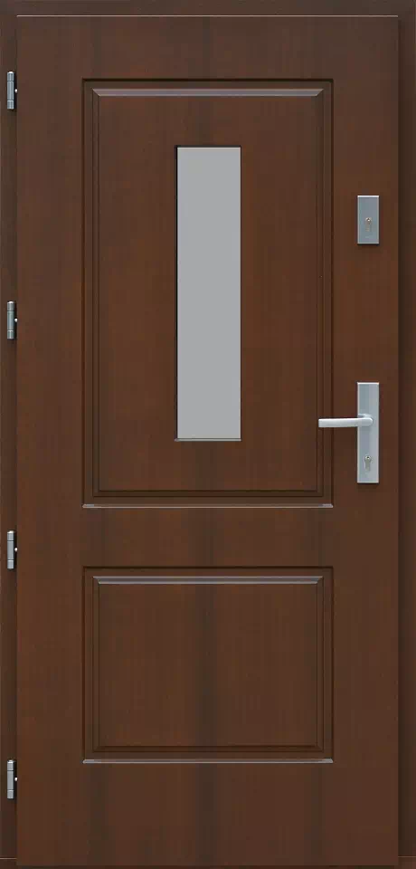 W tym modelu szyba pełni głównie funkcje wizjera - ponieważ jej mała powierzchnia nie gwarantuje dobrego doświetlenia wnętrza domu nawet w przypadku zastosowania szyby bezbarwnej. Powyższy, przykładowy egzemplarz drzwi zewnętrznych został wymalowany na kolor: orzech.