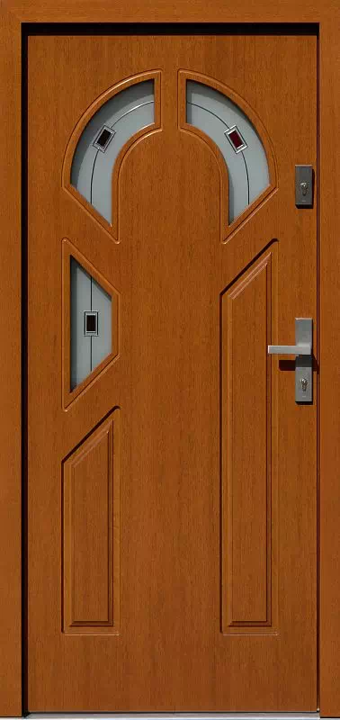 Aktualnie dosyć rzadko zamawiany. Powyższy, przykładowy egzemplarz drzwi zewnętrznych został wymalowany na kolor: złoty dąb.