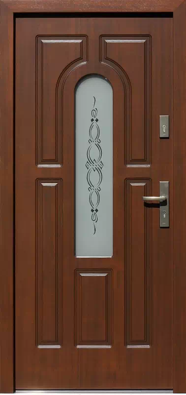 W tym wzorze została zamontowana szyba piaskowana techniką 2D. Powyższy, przykładowy egzemplarz drzwi zewnętrznych został wymalowany na kolor: orzech.