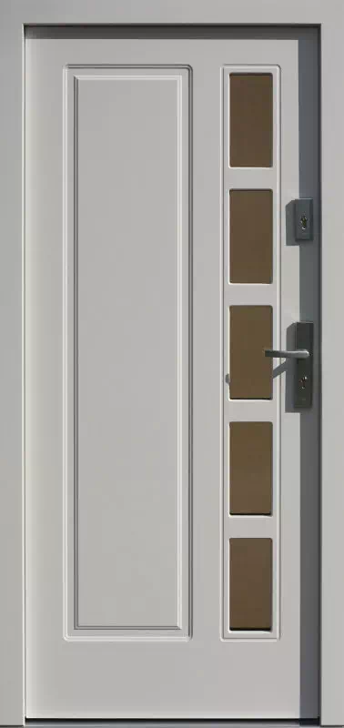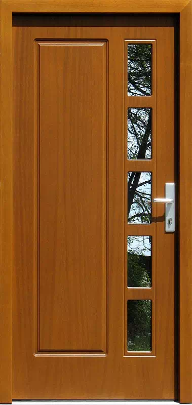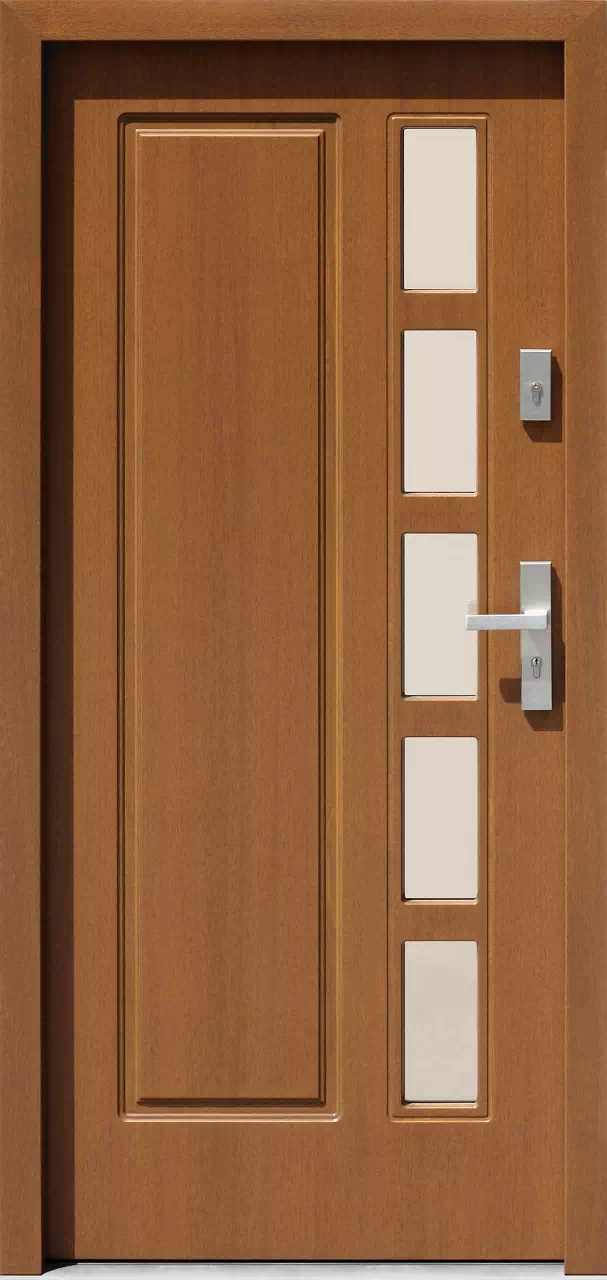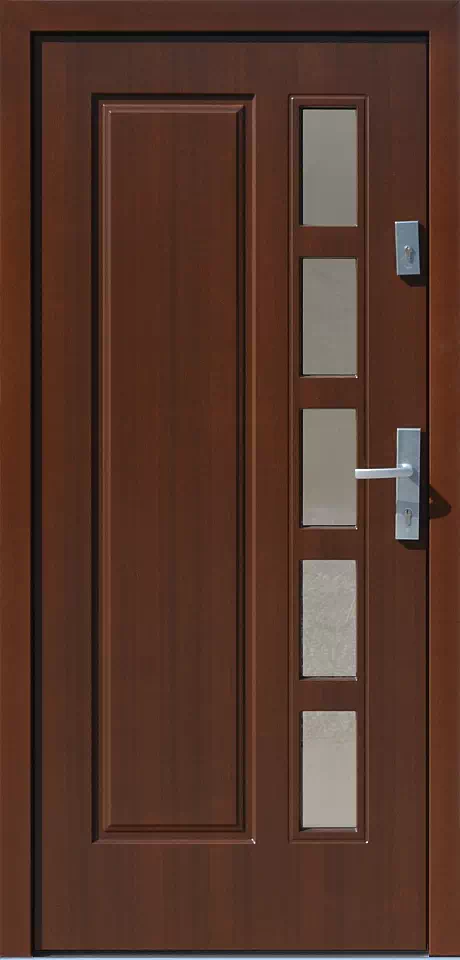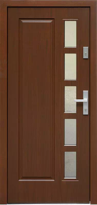 Pięć małych prostokątnych przeszkleń dobrze doświetla wnętrze domu i daje poczucie bezpieczeństwa mieszkańcom domu. Powyższy, przykładowy egzemplarz drzwi zewnętrznych został wymalowany na kolor: orzech.