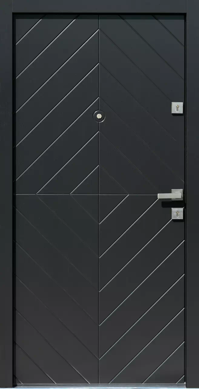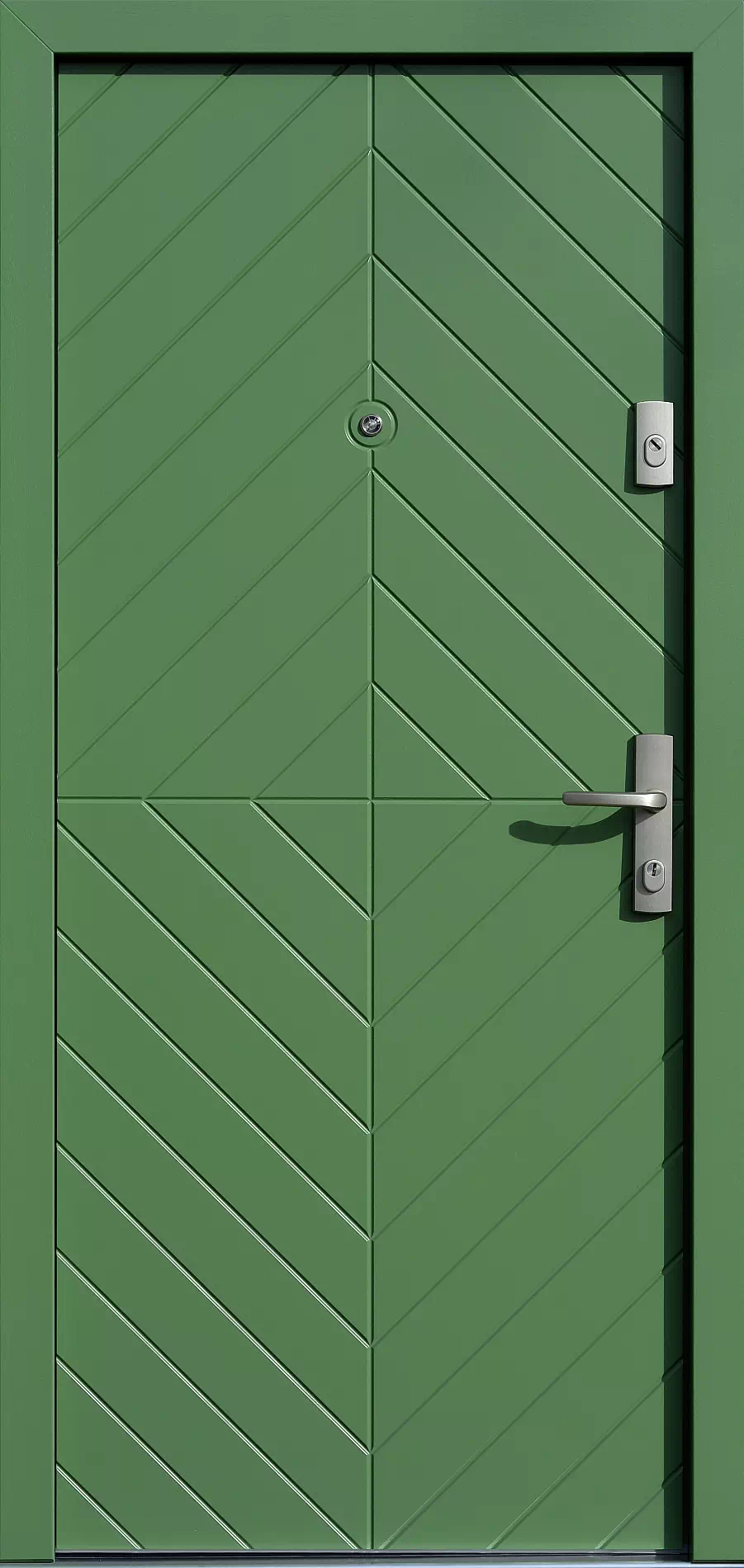 Tego pokroju wzory drzwi aktualnie wracają do łask i zdobywają coraz szersze rzesze klientów. Powyższy, przykładowy egzemplarz drzwi zewnętrznych został wymalowany na kolor: zielone.