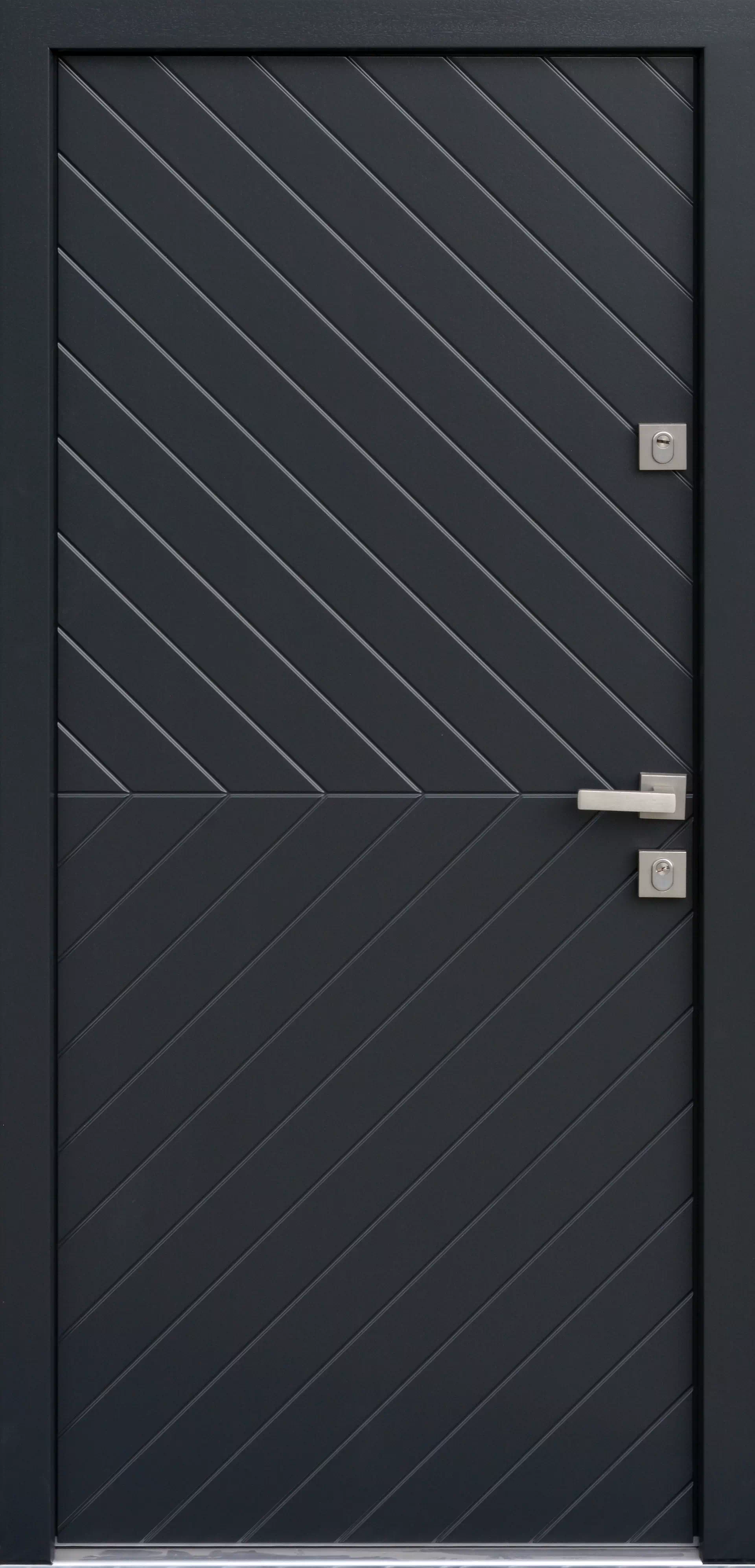 Styl charakteryzujący się skośnym układem wąskich deseczek znajduje także wielu zwolenników w naszym kraju. Powyższy, przykładowy egzemplarz drzwi zewnętrznych został wymalowany na kolor: czarne.