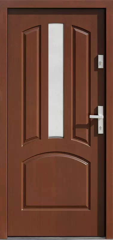 Model ten w szczególności jest dedykowany do domów jednorodzinnych budowanych i urządzanych w tradycyjnym, klasycznym stylu. Powyższy, przykładowy egzemplarz drzwi zewnętrznych został wymalowany na kolor: orzech.
