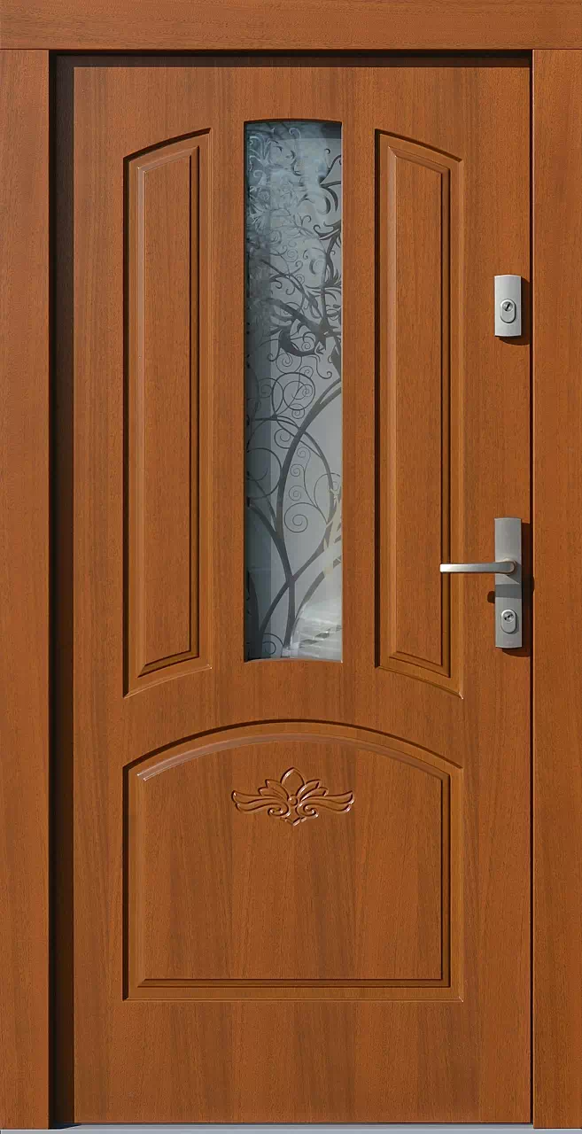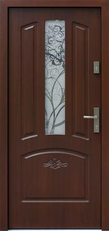 Motyw piaskowania szyby tych drewnianych drzwi zewnętrznych należy traktowany jako opcjonalny i może być zastąpiony każdym innym wzorem. Powyższy, przykładowy egzemplarz drzwi zewnętrznych został wymalowany na kolor: orzech ciemny.