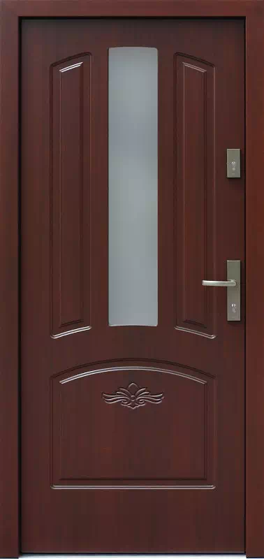 Ozdobny dekor na dolnym kasetonie jest opcją alternatywną. Powyższy, przykładowy egzemplarz drzwi zewnętrznych został wymalowany na kolor: orzech ciemny.