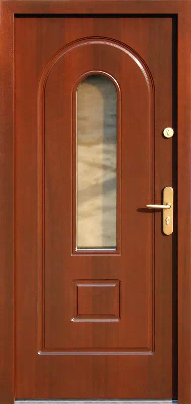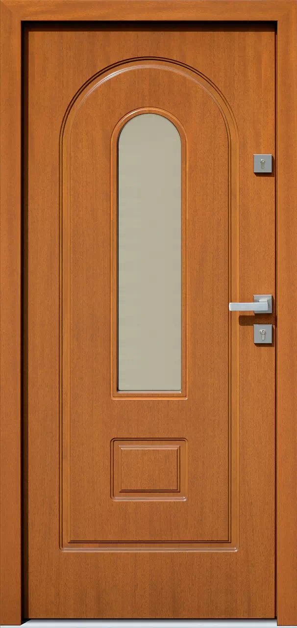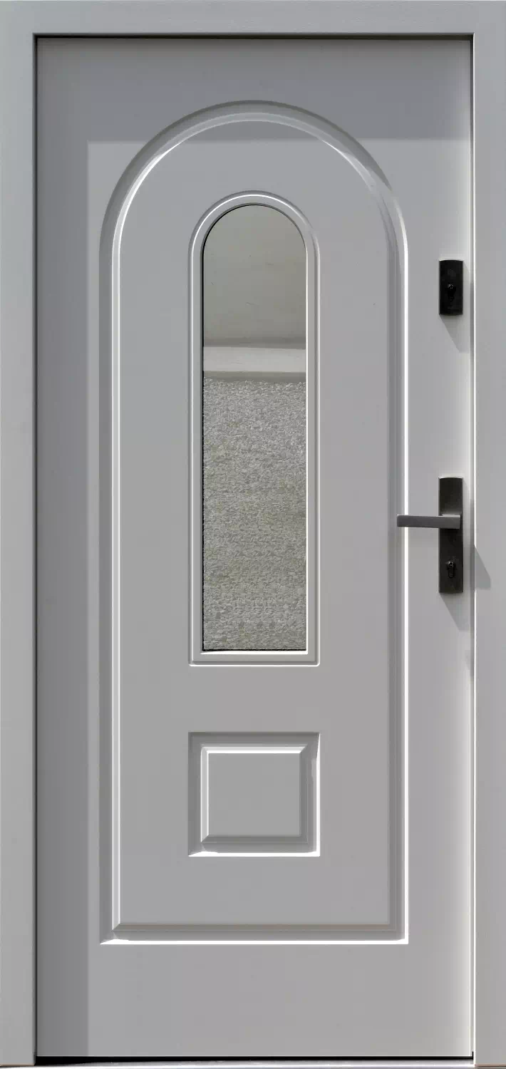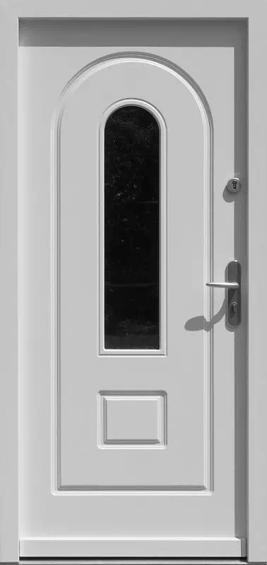 Niezbyt długa, także łukowo wykończona, szyba o szerokości 21 cm i wysokości 93 cm spełnia przeciętne oczekiwania inwestorów co do powierzchni przeszkleń stosowanej w drzwiach wejściowych do domów. Powyższy, przykładowy egzemplarz drzwi zewnętrznych został wymalowany na kolor: białe.