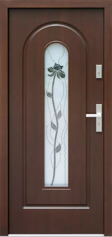 Kolejny wzór drewnianych drzwi zewnętrznych, zaprojektowany jako drzwi wejściowe do tradycyjnych domów jednorodzinnych. Powyższy, przykładowy egzemplarz drzwi zewnętrznych został wymalowany na kolor: orzech.