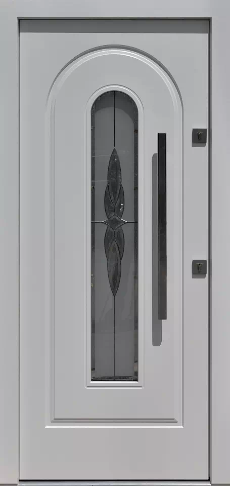Tego typu przeszklenie zawsze jest indywidualnie projektowane i wyceniane. Powyższy, przykładowy egzemplarz drzwi zewnętrznych został wymalowany na kolor: białe.