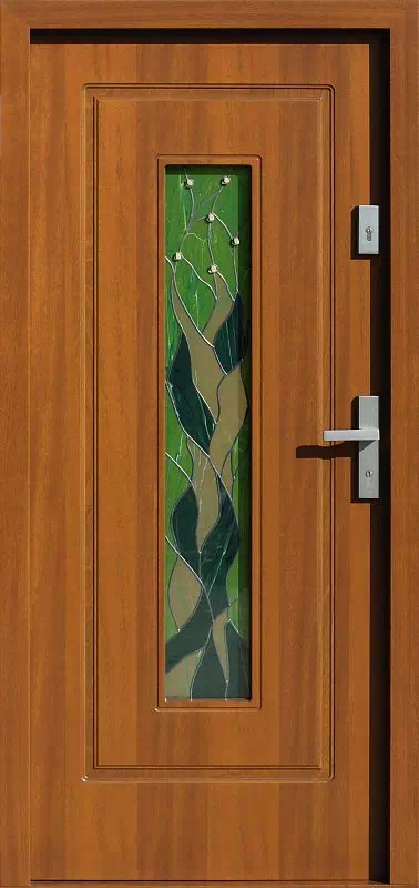 Wzór witrażu i dobór kolorów może być indywidualnie uzgodniony bezpośrednio między pracownią wykonującą witraż a klientem. Powyższy, przykładowy egzemplarz drzwi zewnętrznych został wymalowany na kolor: złoty dąb.